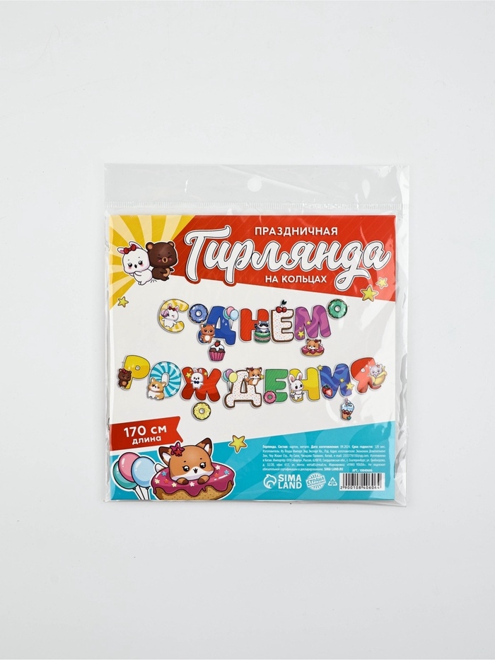 Гирлянда на кольцах "С Днем Рождения", зверята, дл.170 см