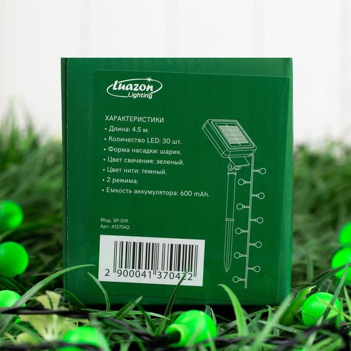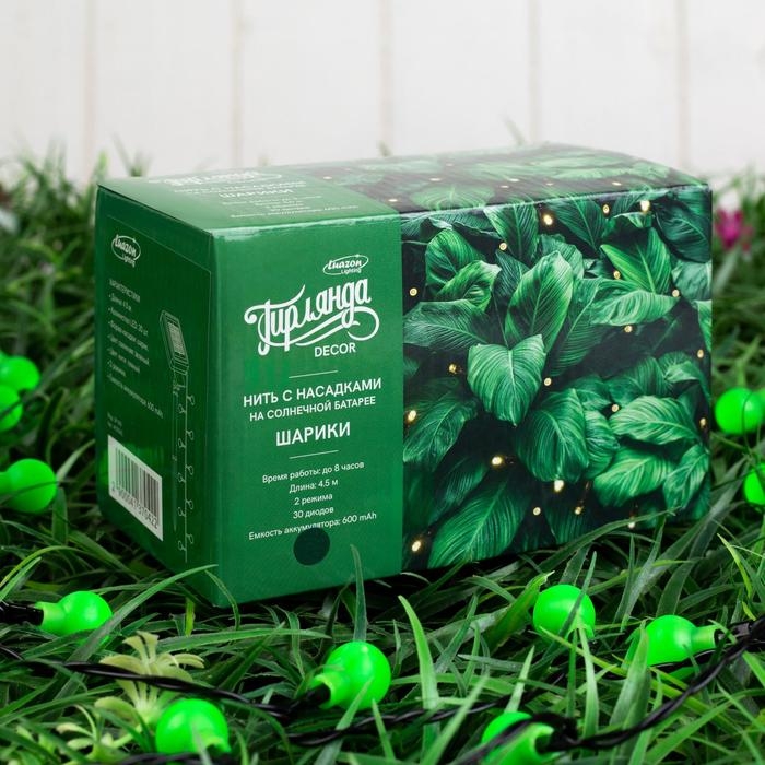 Гирлянда «Нить», 4.5 м, с насадками в виде шариков, IP44, 30 LED, 2 режима, солнечная батарея, тёмная нить, свечение зелёное