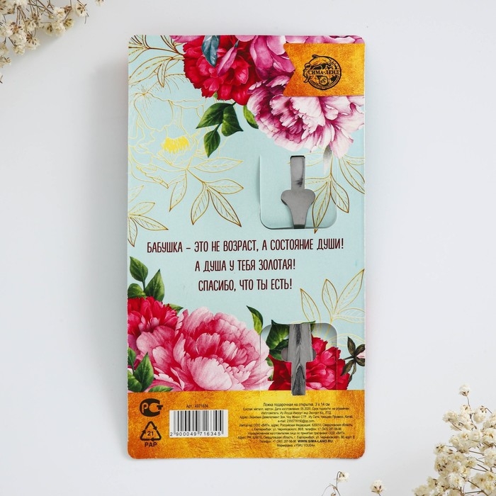 Ложка с лазерной гравировкой и изящной рукояткой преподносится на красочной открытке. На оборотной стороне изделия специально отведено место для подписи: кому и от кого был вручён подарок.