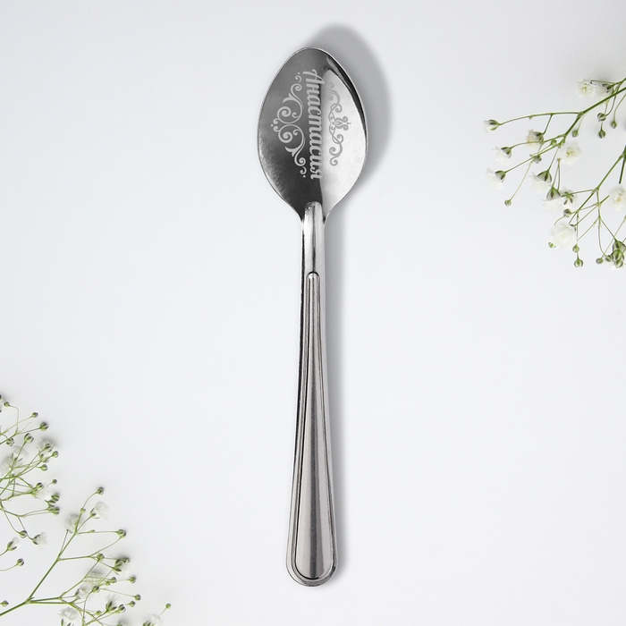 Ложка с лазерной гравировкой и изящной рукояткой преподносится на красочной открытке. На оборотной стороне изделия специально отведено место для подписи: кому и от кого был вручён подарок.
