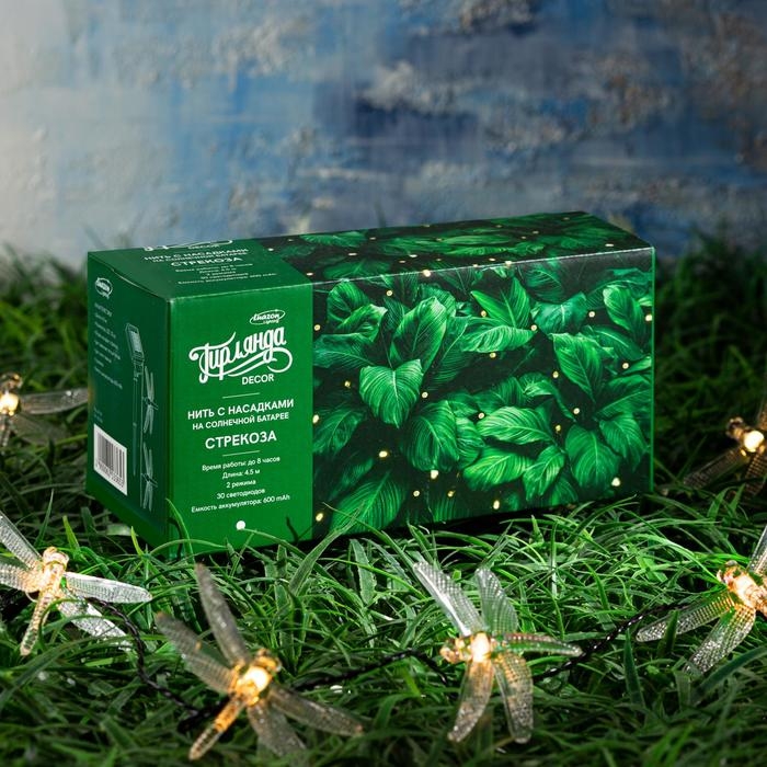 Гирлянда «Нить», 4.5 м, с насадками в виде стрекоз, IP44, 30 LED, 2 режима, солнечная батарея, тёмная нить, свечение тёплое белое