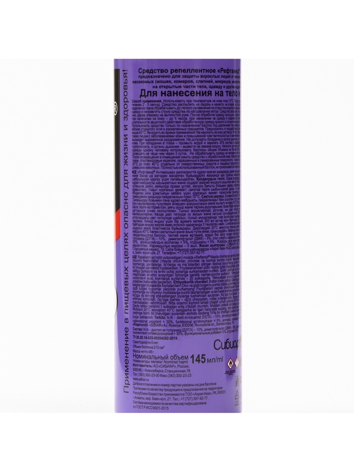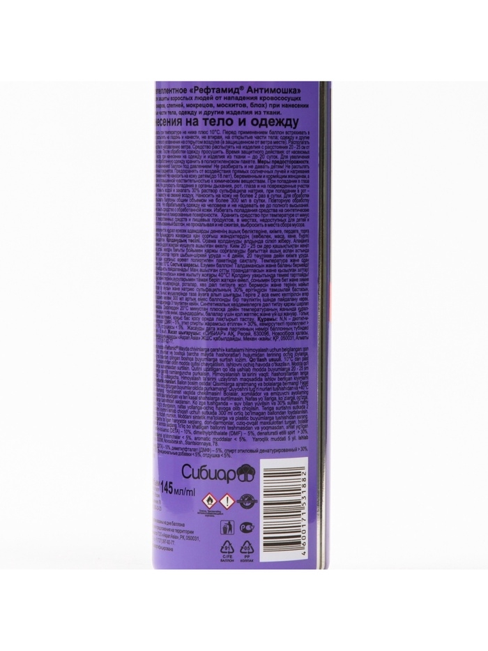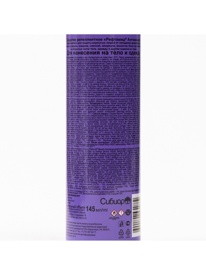 Способ применения: Использовать при температуре не ниже плюс 10°С. Перед применением баллон встряхивать в течение 2-3 секунд. Средство распылить на ладонь и нанести, не втирая, на открытые части тела; одежду и другие изделия из ткани обрабатывать до легкого увлажнения на открытом воздухе (в защищенном от ветра месте). Располагать одежду и направлять струю средства по направлению ветра. Средство распылять на изделия с расстояния 20-25 см от них, держа упаковку на вытянутой руке. После обработки одежду просушить. Время защитного действия: от насекомых при нанесении на кожу - до 4 часов, при нанесении на одежду и изделия из ткани - до 20 суток. Для увеличения длительности защитного действия обработанную одежду хранить в полиэтиленовом пакете. Меры предосторожности: Использовать средство только по назначению! Баллон под давлением! Не разбирать и не давать детям! Не распылять вблизи открытого огня и раскаленных предметов. Предохранять от воздействия прямых солнечных лучей и нагревания выше 40? С. Не курить во время применения! Не наносить на кожу детям (до 18 лет), беременным и кормящим женщинам, а также лицам с заболеваниями кожи и повышенной чувствительностью к химическим веществам. При попадании в глаза вызывает выраженное раздражение. Не допускать попадания в органы дыхания, рот, глаза и на поврежденные участки кожи. При попадании в глаза - промыть водой и закапать 30% раствор сульфацила натрия, при попадании в рот - прополоскать, в органы дыхания - вывести на свежий воздух. Наносить на кожу не более 2 раз в сутки. Для обработки одежды одному человеку использовать баллоны общим объемом не более 300 мл в сутки. Повторную обработку проводить не чаще чем через 3 суток. Не обрабатывать одежду на человеке и не надевать ее до полного высыхания. После возвращения в помещение смыть средство с обработанной кожи. Избегать попадания средства на синтетические ткани, пластмассовые изделия, окрашенные и лакированные поверхности. Условия хранения: Хранить средство при температуре от минус 20 С до плюс 40 С отдельно от лекарственных средств и пищевых продуктов, в местах, недоступных для детей и домашних животных. Полностью использованный баллон, не прокалывая и не сжигая, выбросить в места сбора мусора. Состав: N, N - диэтил-м-толуамид (ДЭТА) - 10%, диметилфталат (ДМФ) - 5%, (спирт входящий в рецептуру) > 30%, пропеллент углеводородный > 30%, функциональные добавки < 5%, отдушка < 5%.