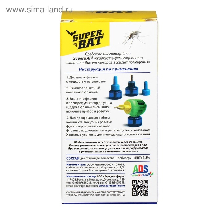 Дополнительный флакон к электрофумигатору для уничтожения комаров в помещениях. Увеличенный объем избавляет от насекомых на 30 ночей!При использовании универсального электрического фумигатора «SuperBat», достаньте из коробки флакон с жидкостью от комаров «SuperBat», отверните защитный колпачок.Вставьте флакон в электрический фумигатор «SuperBat» и плотно прикрутите.Включите прибор в электросеть, поверните вилку прибора так, чтобы флакон располагался вертикально.При использовании противомоскитной пластины вынуть ее из упаковки и вложить в электрический фумигатор «SuperBat». Вилку повернуть согласно розетке и включить прибор в электросеть на 220 Вольт.Средство начинает действовать через 10-15 минут после включения.Уничтожение комаров достигается за 1-2 часа.При открытых на ночь окнах и форточках электрический фумигатор «SuperBat» с флаконом или пластиной оставьте включенным на всю ночь для уничтожения залетающих комаров.Запрещается одновременное применение флакона с жидкостью и пластины.Составпраллетрин 0,7%,растворитель,стабилизатор