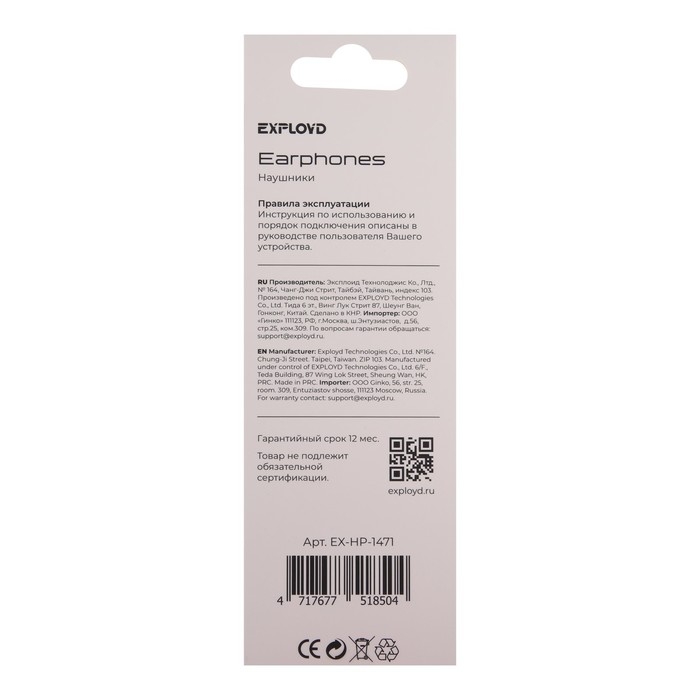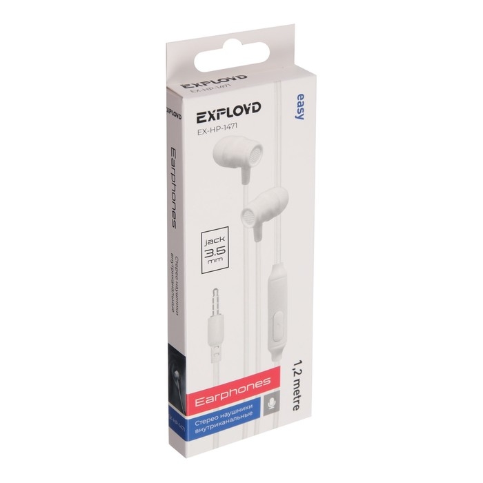 Наушники Exployd EX-HP-1471, вакуумные, микрофон, проводные, 108 дБ, 1.2 м, 3.5 мм, белые