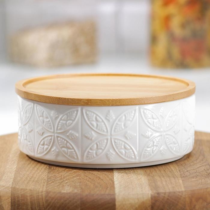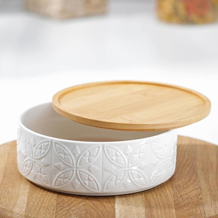 Банка для сыпучих продуктов BellaTenero «Листья», 500 мл, 13×9.5 см, с бамбуковой крышкой, фарфор, белая