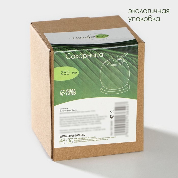 Сахарница фарфоровая с ложкой на бамбуковой подставке BellaTenero, 250 мл, цвет белый