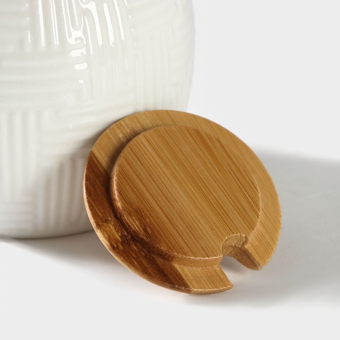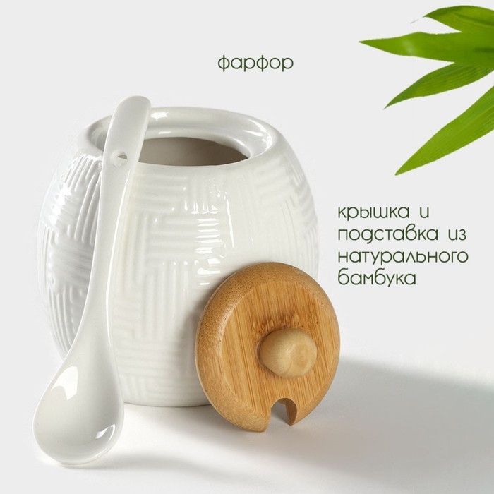 Сахарница фарфоровая с ложкой на бамбуковой подставке BellaTenero, 350 мл, цвет белый