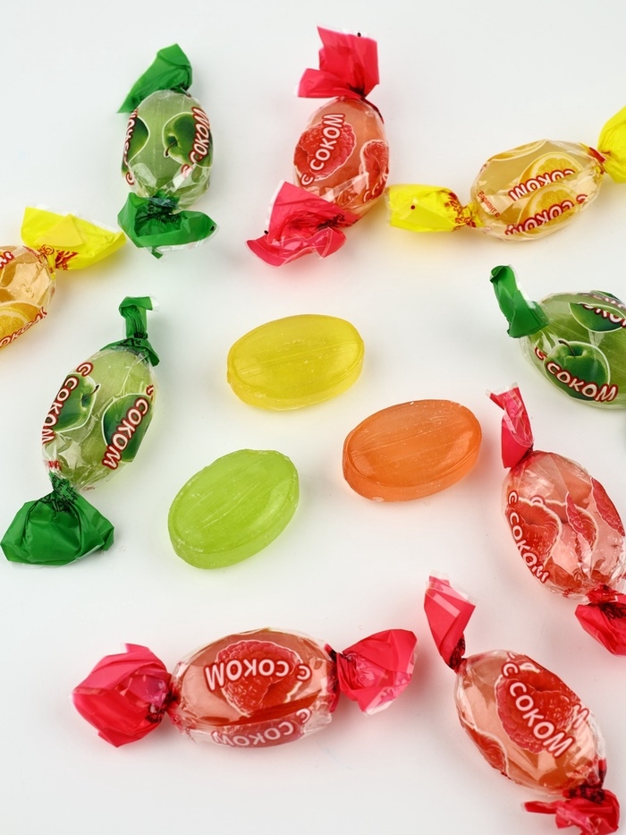 Состав: патока, сахар, регулятор кислотности – кислота лимонная, ароматизаторы, масло растительное, краситель – куркумин, медные комплексы хлорофиллинов, концентрированные соки: фиолетовой моркови, малины, яблока, лимона. Может содержать диоксид серы, следы глютена, яиц, молока, арахиса, сои, орехов и продуктов их переработки.