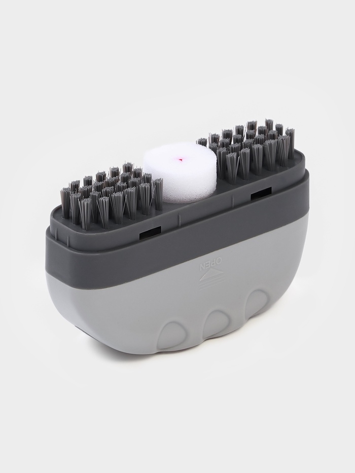 - Удобный механизм: нажатие на губку активирует подачу моющего средства, которое равномерно распределяется по поверхности обуви.