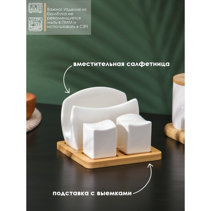 Набор для специй на деревянной подставке BellaTenero, 4 предмета: солонка 75 мл, перечница 75 мл, салфетница, ёмкость для зубочисток, цвет белый