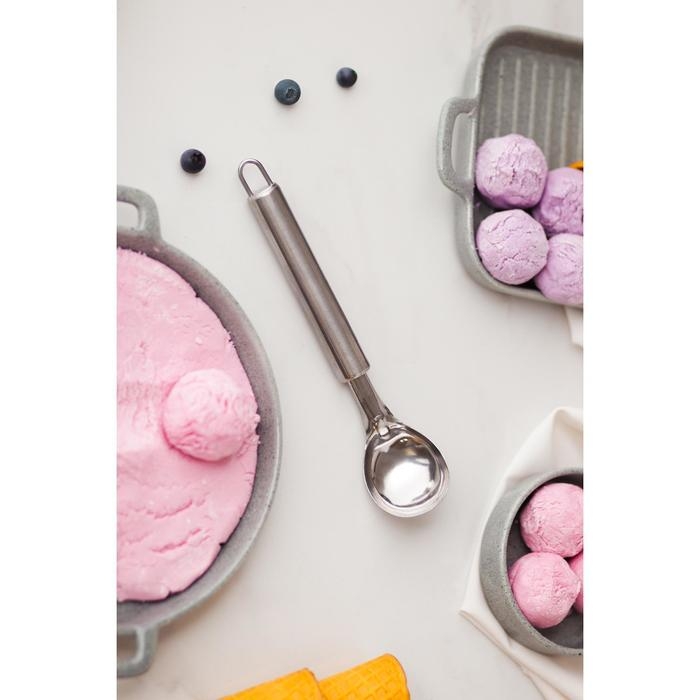 - Специальный прибор из нержавеющей стали позволяет удобно черпать замороженную массу и выкладывать ее аккуратными шарами.