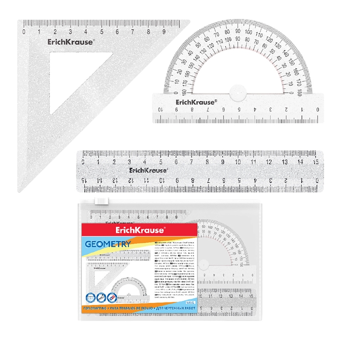 Набор чертёжный ErichKrause Clear Glitter, малый (линейка, угольник, транспортир), прозрачный с блёстками, zip-пакет