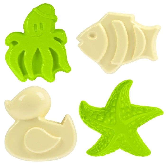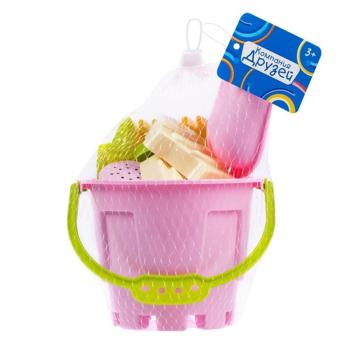 Песочный набор: ведро 1,2 л, лопатка, грабли, 4 формочки, лейка 0,2 л, розово-салатовый