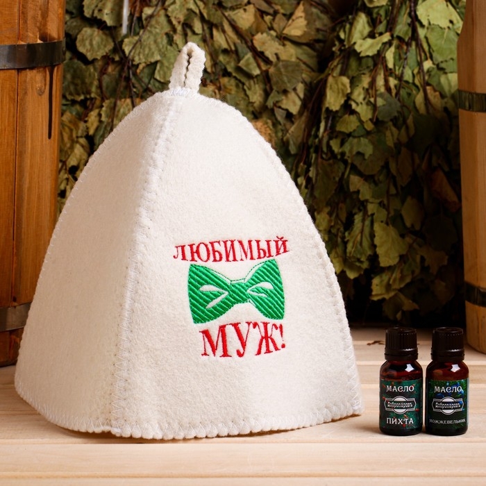 Набор для бани в коробке "Любимый муж" шапка, масло можжевельника и пихты