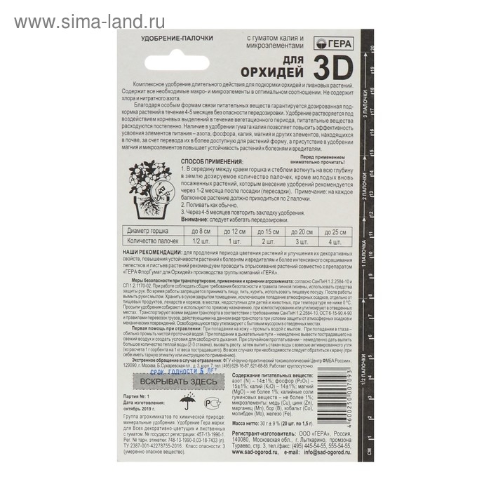 Удобрение Гера 3D для орхидей, выполненное в виде палочек, обеспечивает длительное действие. Оно предназначено для подкормки орхидей и лиановых растений.