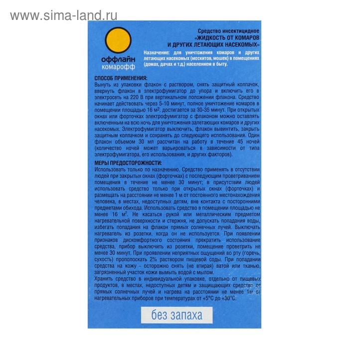 Назначение: для уничтожения комаров и других летающих кровососущих насекомых (москитов, мошек) в помещениях населением в быту, в том числе в присутствии детей.Способы применения: вынуть из упаковки флакон с раствором, снять защитный колпачок, ввернуть флакон в электрофумигатор до упора и включить его в электросеть на 220 В при вертикальном положении флакона. Полное уничтожение насекомых достигается менее чем через 1 час. При открытых окнах (форточках) электрофумигатор с флаконом можно оставлять включенным на всю ночь для уничтожения залетающих комаров и других насекомых. Электрофумигатор выключить, флакон вывинтить, закрыть защитным колпачком и сохранять до следующего использования. Меры предосторожности: использовать только по назначению. Средство применять в отсутствие людей при закрытых окнах (форточках) и размещать на расстоянии не менее 1 м от кровати ребенка и постоянного местонахождения человека. Использовать средство в помещении площадью не менее 13м2. Работающий электрофумигатор устанавливать в местах, недоступных детям, вне контакта с посторонними предметами обихода. Не касаться рукой или металлическим предметом нагревательной поверхности и стержня, не допускать попадания воды. Избегать попадания прямых солнечных лучей на флакон. Не накрывать нагреватель во время работы посторонними предметами. Выключать нагреватель из розетки, когда он не используется. При попадании средства на кожу - осторожно снять (не втирая) ватой или тканью. При попадании средства в глаза - тщательно и обильно промыть водой. При попадании в рот - прополоскать водой, выпить несколько стаканов воды с 10-20 измельченными таблетками активированного угля. При необходимости обратиться ко врачу. Хранить средство при t от 0°С до + 30°С в упаковке отдельно от пищевых продуктов, в местах недоступных детям и защищающих средство от прямых солнечных лучей и нагрева, на расстоянии не менее 1 м от нагревательных приборов.защищает бережно с натуральным экстрактом ромашки.Состав: натуральные пиретрины (0,025%), трансфлутрин (0,1%), праллетрин (0,5%), растворитель.Класс опасности: 4 (малоопасное вещество).Объём: 30 мл.