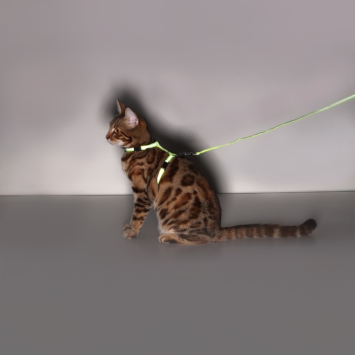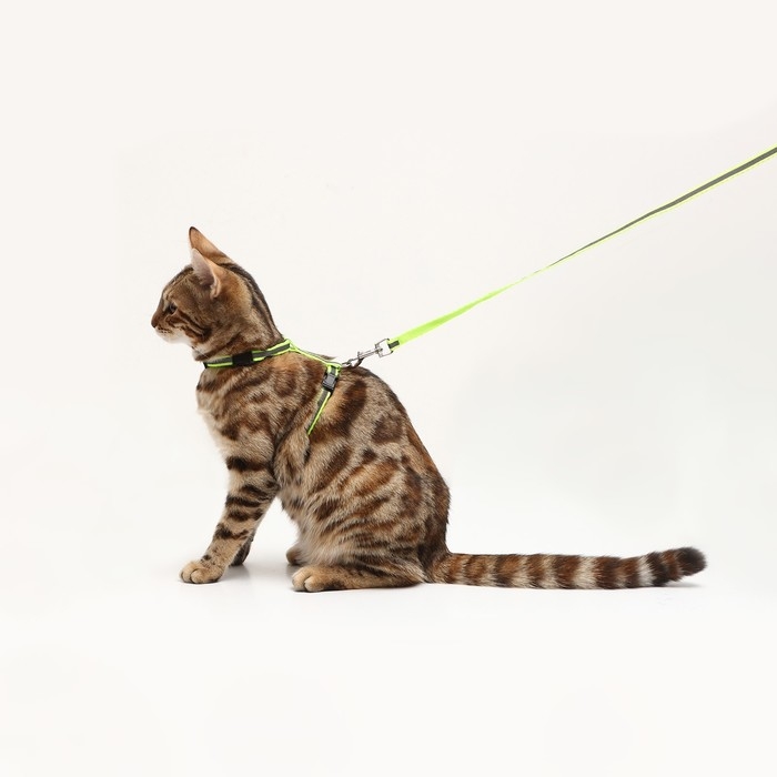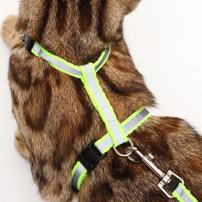 Ширина ленты составляет 1 см, поводок имеет длину 120 см, что позволяет вашей собаке или кошке свободно двигаться, а шлейка регулируется в диапазоне от 26 до 40 см, что обеспечивает идеальную посадку на любую породу животных. Светоотражающая лента на комплекте амуниции обеспечивает дополнительную безопасность в темное время суток, делая вашего питомца более заметным для водителей и других пешеходов.