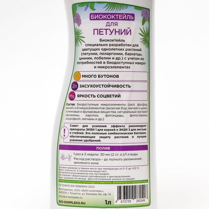 Натуральный состав биококтейля разработан специально для бережного ухода за однолетними цветами (петунии, пеларгонии, бархатцы, циннии, лобелии, астры, портулаки и мн. др.).
