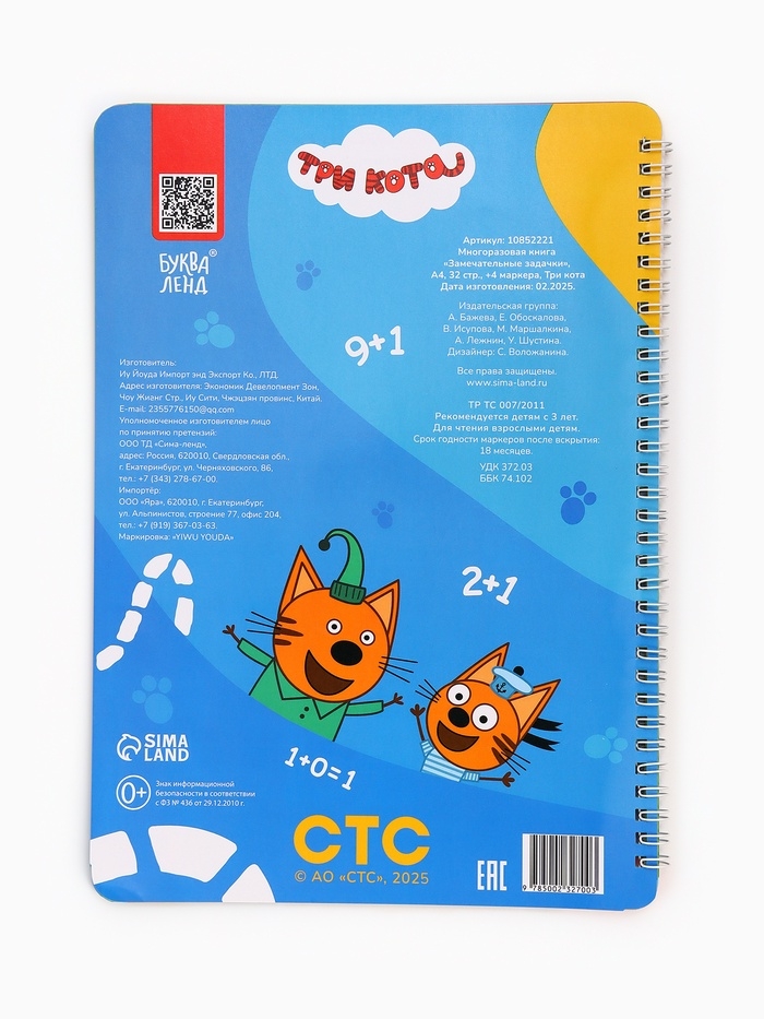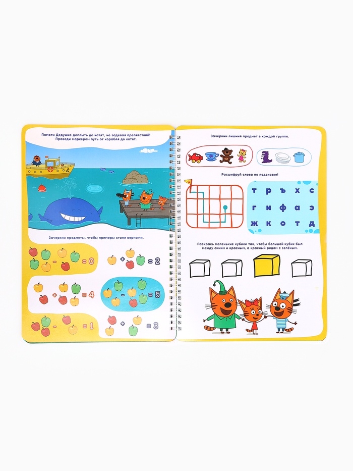 Многоразовая книга "Замечательные задачки", А4, 32 стр., +4 маркера, Три кота