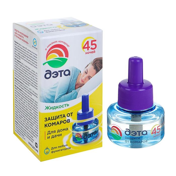 Жидкость от комаров и летающих насекомых для фумигатора, детский, ДЭТА незаменима для уничтожения комаров и других летающих насекомых (москитов, мошек, мух) в комнате.Специально разработанная рецептура, без запаха, гарантирует безопасность и эффективность использования. Подходит для малышей с двух лет. В составе натуральный пиретрин – экстракт далматской ромашки, природный инсектицид, безопасный для детей и беспощадный в борьбе с комарами.Один флакон жидкости обеспечивает крепкий сон ребёнка без надоедливых комаров на протяжении 45 ночей!Полное уничтожение комаров уже через 1 час после начала работы фумигатора. Жидкость подходит к большинству электрофумигаторов. Максимальный эффект достигается при использовании жидкости в комплекте с фумигатором БЭБИ ДЭТА.Для защиты от комаров и борьбы с другими насекомыми в ассортименте бренда ДЭТА представлена широкая линейка средств: для использования на улице и для домашнего использования; товары подходят для детей и взрослых. Со средствами бренда ДЭТА ваши любимые активности на природе – прогулка и пикник в парке или в лесу, выезд на природу, на дачу, в поход, на рыбалку, охоту, за грибами или на фестиваль пройдут без комаров.Для детской кожи особенно важно использовать безопасные средства от комаров. В ассортименте бренда ДЭТА есть спреи и аэрозоли, которые подходят для малышей и младенцев уже с 9 месяцев. Средства содержат пантенол, алоэ вера, аллантоин, в состав входит также ромашка и другие натуральные компоненты, которые помогают смягчить и увлажнить кожу, предотвращая раздражение от укусов комаров и других насекомых. Также для безопасного детского использования мы разработали браслеты и клипсы от комаров, которые удобно использовать во время прогулок на свежем воздухе.Торговая марка ДЭТА предлагает самые удобные формы средств помощи против насекомых - вредителей: аэрозоль, спрей, крем, молочко, гель, комплект (набор) фумигатор и жидкость или пластины (таблетки), стержни, спирали. Они содержат отпугивающие вещества и эффективно отгоняют комаров, а также других вредителей.Большинство средств содержат активные компоненты – дэта (диэтилтолуамид) или ir3535 - эффективное против насекомых вещество, которое безопасно для использования в соответствии с инструкцией по применению к средству (это справедливо в т.ч. для бытовой химии, косметических средств, репеллентов и инсектицидов).Мы также рекомендуем попробовать средства ДЭТА против клещей (в т.ч. иксодовых клешей), мошек, мокрецов, слепней, москитов, ос, клопов, блох, мух, тараканов и других летающих насекомых. Продукты ДЭТА защитят ваш дом от назойливых насекомых, обеспечат приятную и беззаботную прогулку на свежем воздухе и отдых на даче для всей семьи. Состав:натуральные пиретрины (0,025%), трансфлутрин (0,1%), праллетрин (0,5%); растворитель.
