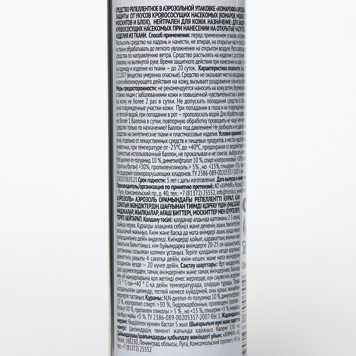 «Комарофф» — это средство для всей семьи по доступной цене. Современные репелленты обладают высоким качеством, совершенно безвредны для людей и моментально уничтожают таких насекомых, как комары, мошки, клещи, слепни, мокрецы. В тёплую погоду они обеспечивают надёжную защиту на срок от 4 до 8 часов.Новые разработки и исследования проводятся каждый год, что позволяет создавать качественную и безопасную продукцию.Аэрозоль предназначен для эффективной защиты от укусов комаров, москитов, слепней и других кровососущих насекомых. Удобно обрабатывать большие поверхности. Следует наносить на открытые части тела, одежду и прочие тканевые изделия. Не оставляет пятен, нейтрален для кожи.Состав: демитилфлатат спирт, изопропиловый пропеллент, углеводородный пропиленгликоль.