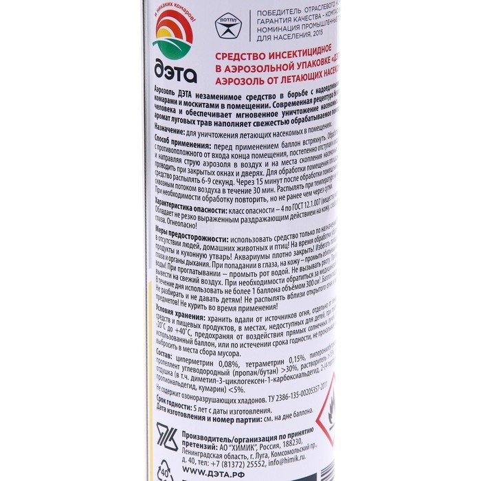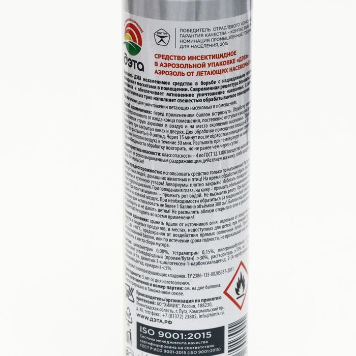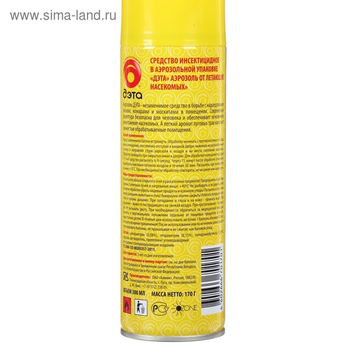 Аэрозоль «Дэта» — это средство от всех летающих насекомых для применения на открытом воздухе. Уничтожает при контакте (вещество с шокирующим эффектом, которое воздействует непосредственно на паразитов). Средство подходит для применения весной и летом. Вещество относится к F — легковоспламеняющееся. Объем — 300 мл. Страна производства — Россия.Использование:Выведите из комнаты людей и животных.Распыляйте средство при температуре не ниже +10 °С.Перед применением встряхните баллон.Закройте окна и начинайте обработку с противоположного от входа конца помещения, постепенно отступая ко входной двери.Направляйте струю на места скопления насекомых.Сразу после обработки покиньте помещение на 15 минут.Для обработки помещения площадью 10-14 м² распыляйте средство 6-9 секунд.Через 15 минут после обработки проветрите помещение в течение 30 минут.При необходимости повторите обработку, но не ранее чем через сутки. Действующее вещество – d-аллетрин, краситель, окислитель, консервант, древесная мука.