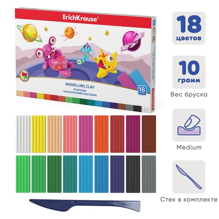 Классический пластилин ErichKrause® с новой улучшенной формулой, ярких востребованных цветов предлагается в картонной коробке в комплекте со стеком для декорирования.