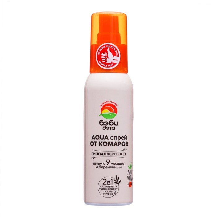 СоставИР 3535 (этил-3-[N-бутилацетамидо]-пропионат) 10%, вода >30%, пропиленгликоль>15%, но < 30%, Алоэ Вера < 5%, аллантоин < 5%, консервант (в т.ч. метилизотиазолинон, бензизотиазолинон)< 5%, отдушка (в т.ч. лимонен, линалоол, бензилсалицилат, цитраль) < 5%.Инструкция по применениюНажимая пальцем на распылительную головку, нанесите средство на ладонь и, не втирая, равномерно обработайте открытые участки тела: лицо, руки, шею, ноги.Обработку одежды и других изделий из тканей производите с расстояния 10-15 см до легкого увлажнения.Располагайте одежду и направляйте струю средства по направлению ветра.Описание«ДЭТА АКВА (AQUA) спрей для чувствительной кожи» специально разработан для бережной и щадящей защиты взрослых и детей с 9 месяцев при нанесении на открытые части тела, одежду и другие изделия из ткани.Эффективно защищает от укусов комаров, москитов и мокрецов при нанесении на кожу в течение 2-х часов.Благодаря рецептуре на водной основе «ДЭТА АКВА (AQUA) спрей для чувствительной кожи» не сушит и не раздражает кожные покровы, а входящий в состав Алоэ Вера ухаживает, смягчая и увлажняя.Не содержит спирт