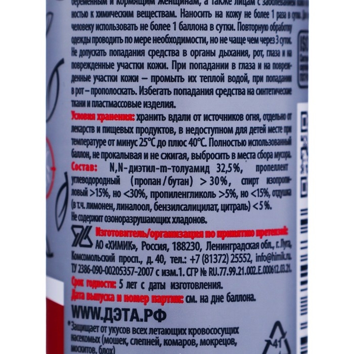 СоставN,N- диэтил-m-толуамид 32,5%, пропеллент углеводородный (пропан/бутан) >30%, спирт изопропиловый >15%, но < 30%, пропиленгликоль >5%, но < 15%, отдушкаРекомендации по применениюперед применением упаковку встряхнуть в течение 2-3 секунд.Одежду и другие изделия из ткани обрабатывать на открытом воздухе. Располагать одежду и направлять струю средства по направлению ветра. Средство распылять на изделия с расстояния 20-25 см от них, держа упаковку на вытянутой руке.Для защиты от насекомых распылить средство на ладонь и нанести, не втирая, на открытые ча-сти тела; одежду и другие изделия из ткани обрабатывать до легкого увлажнения.Для защиты от клещей обрабатывать весь комплект одежды из расчета 20 сек/м2, особенно тщательно – вокруг щиколоток, коленей, бедер, плечевого пояса и мест возможного проникновения клещей к телу. ОписаниеДля защиты людей от нападения кровососущих насекомых (мошек, слепней, комаров, мокрецов, москитов, блох) и иксодовых клещей (переносчиков возбудителей клещевого энцефалита и болезни Лайма) при нанесении на открытые части тела, одежду и другие изделия из ткани.Время защитного действия: от насекомых при нанесении на кожу – более 4 часов, при нанесении на одежду и изделия из ткани - до 30 суток; от клещей при нанесении на одежду – до 5 суток.