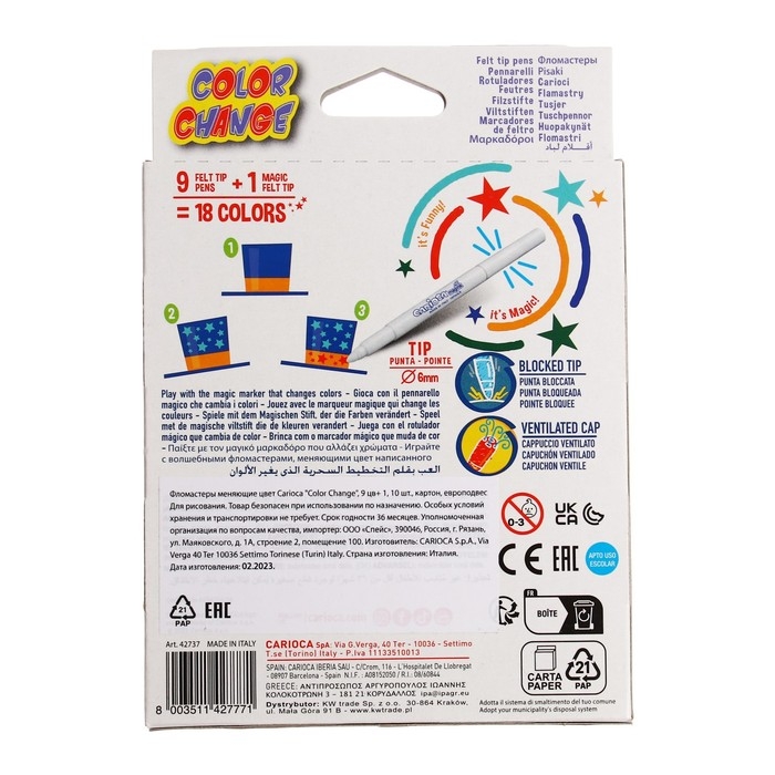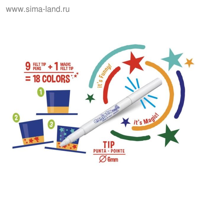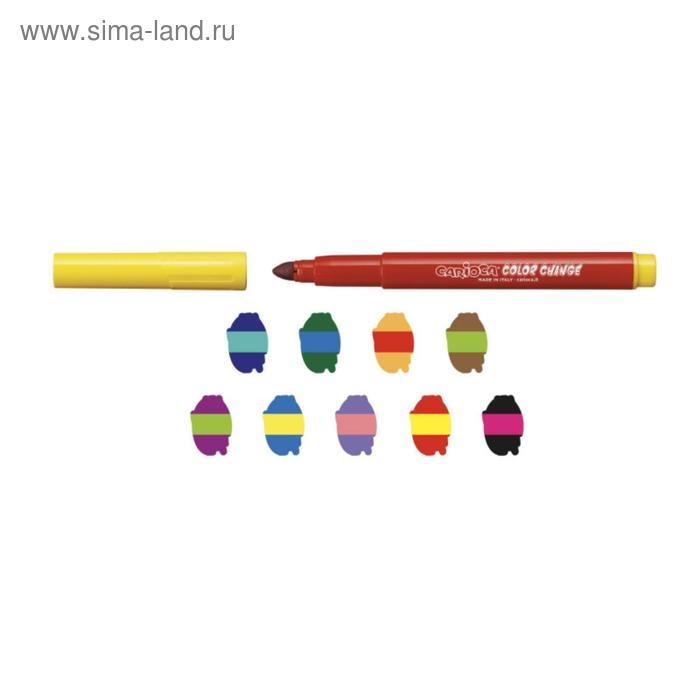 Фломастеры 9 цветов Carioca "Magic" +1 перекрашивающий, утолщенные 6.0 мм, несмываемые, картон, европодвес