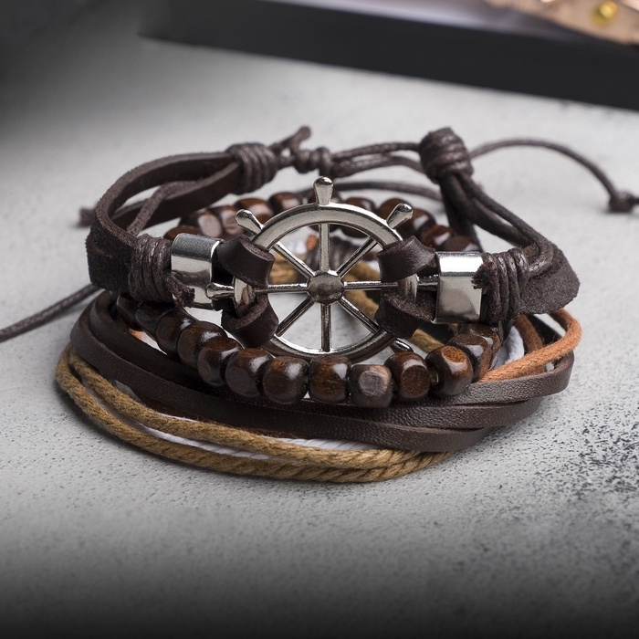 Браслет кожа «Мачта» штурвал, цвет бежево-коричневый в серебре, d=7,5 см