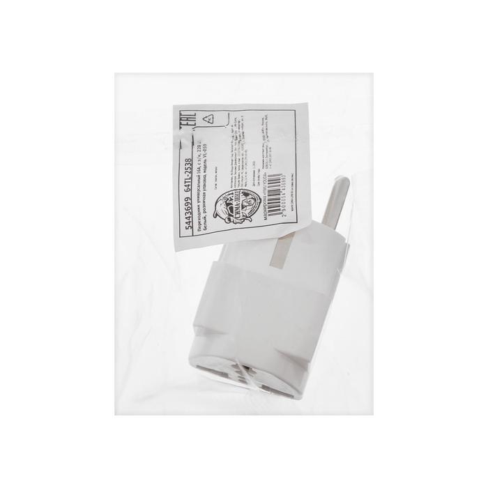 Переходник универсальный 16А, с з/к, 220 В, белый, розничная упаковка
