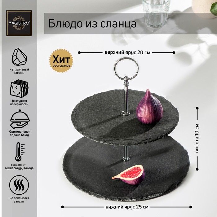 Блюдо из сланца Magistro Valley, 2-ярусное, станет отличным выбором для сервировки стола и подачи блюд. Изготовленное из натурального камня, оно обладает уникальным дизайном и высокой прочностью. Благодаря двухъярусной конструкции, это блюдо позволяет красиво и компактно расположить закуски или десерты.