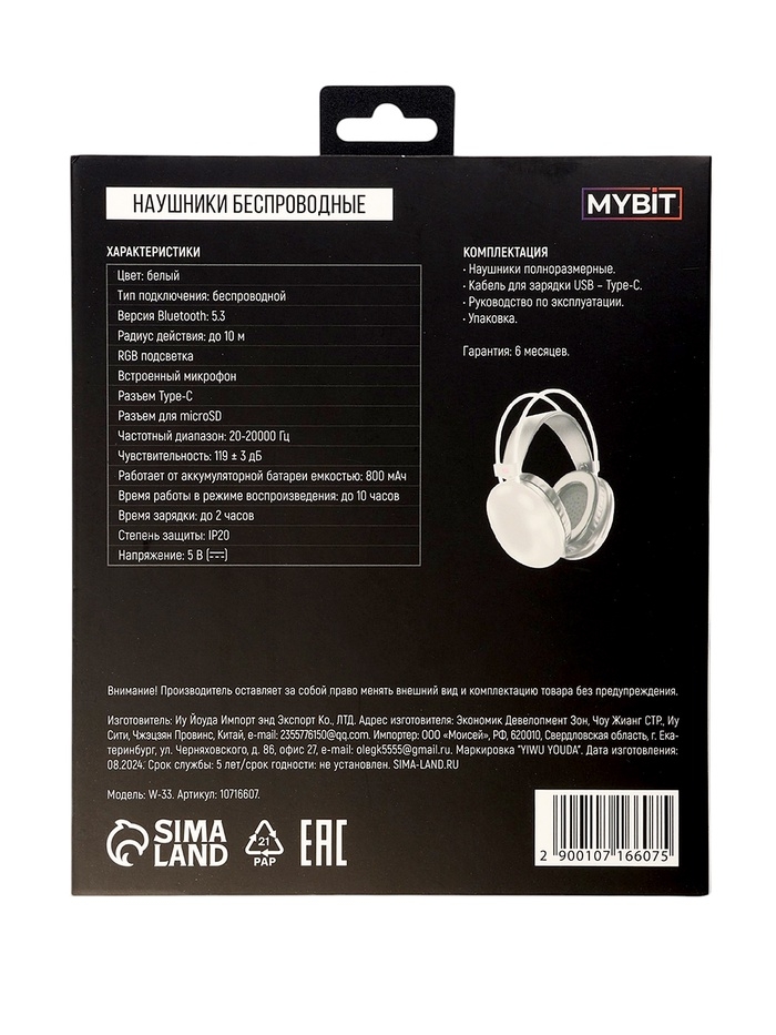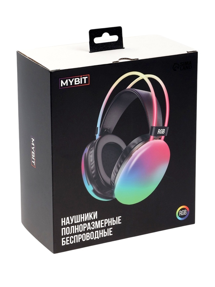 Наушники полноразмерные Mybit W-33, RGB подсветка, BT5.3, 800 мАч, Type-C, белые