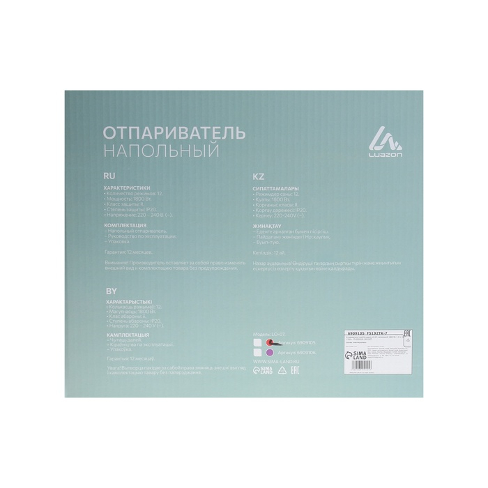 Отпариватель Luazon LO-07, напольный, 1800 Вт, 1.4 л, 46 г/мин., 12 режимов, фиолетовый
