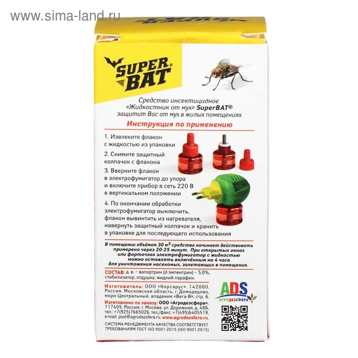 Дополнительный флакон к электрофумигатору для уничтожения мух в помещениях.При использовании универсального электрического фумигатора «SuperBat», достаньте из коробки флакон с жидкостью от мух «SuperBat», отверните защитный колпачок. Вставьте флакон в электрический фумигатор «SuperBat» и плотно прикрутите. Включите прибор в электросеть, поверните вилку прибора так, чтобы флакон располагался вертикально. При использовании противомоскитной пластины вынуть ее из упаковки и вложить в электрический фумигатор «SuperBat». Вилку повернуть согласно розетке и включить прибор в электросеть на 220 Вольт.Средство начинает действовать через 10-15 минут после включения. Уничтожение мух достигается за 1-2 часа. При открытых на ночь окнах и форточках электрический фумигатор «SuperBat» с флаконом или пластиной оставьте включенным на всю ночь для уничтожения залетающих мух. Состав: вапортрин, стабилизатор, отдушка, жидкий парафин