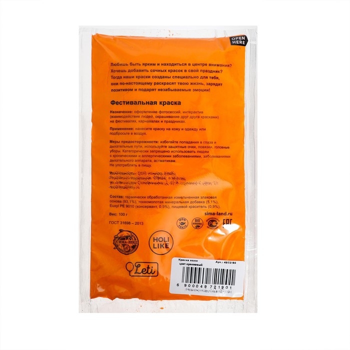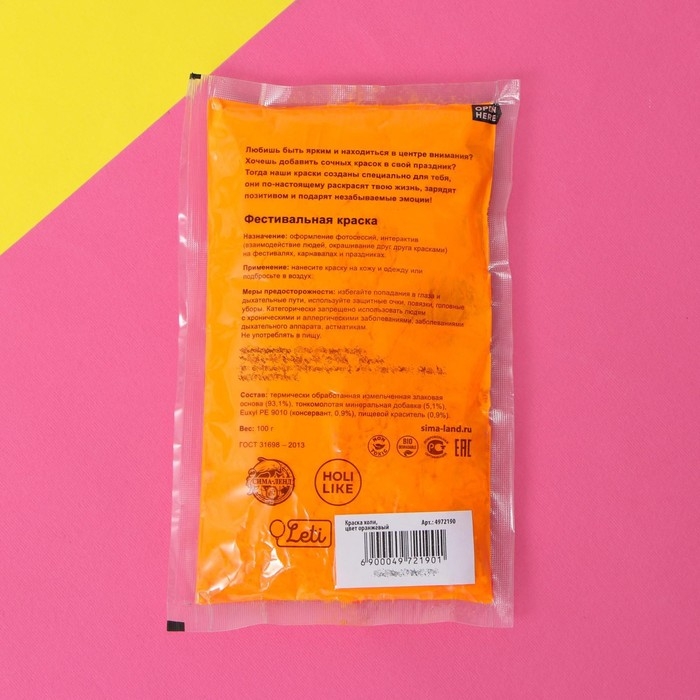Краска холи, цвет оранжевый, 100 г