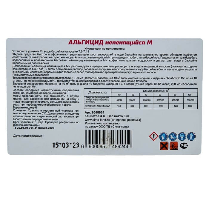 Средство предназначено против роста водорослей в воде бассейна. Эффективно удаляет водоросли на долгое время и делает цвет воды в бассейне идеальным, рН нейтрален, не содержит хлора и тяжёлых металлов, с пониженным пенообразованием. Не рекомендуется использовать в бассейнах с противотоками, фонтанами, гейзерами и в спа-бассейнах. Способ применения: перед использованием произвести обратную промывку фильтра. Добавлять с помощью мерника или автоматического дозатора непосредственно в плавательный бассейн около места подачи воды или в нескольких местах по периметру (только не перед фильтрами) при работающем циркуляционном насосе.