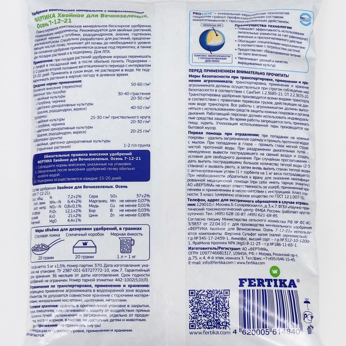 Результат применения: Хвойные лучше переносят морозы, сохраняют насыщенный цвет хвои. Весной растения быстрее трогаются в рост. Одна упаковка 5 кг рассчитана на обработку нескольких деревьев или кустарников.