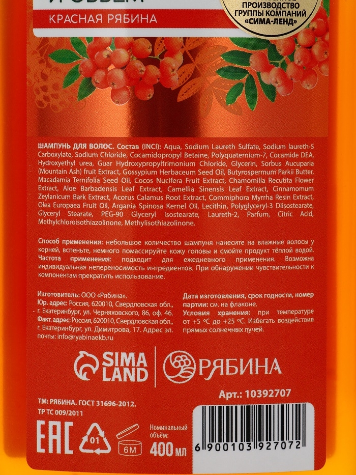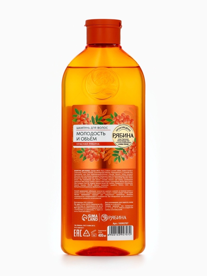 Шампунь для волос, молодость и объем, аромат рябины, 400 мл, Рябина