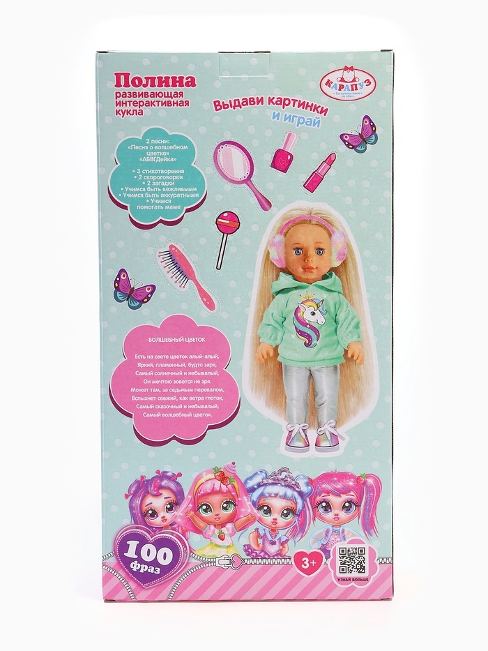Интерактивная кукла «Полина» с аксессуарами станет любимой игрушкой малышки. Она знает 100 фраз, поёт песни, закрывает глазки и рассказывает стихи, превращая обычные игры в яркие моменты общения и обучения.