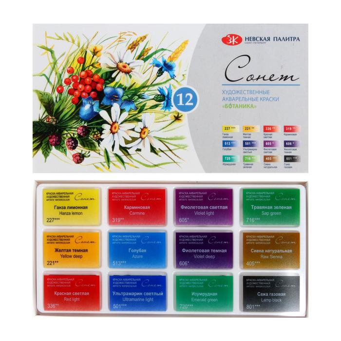Акварель художественная в кюветах, 12 цветов х 2.5 мл, ЗХК "Сонет", "Ботаника", 35411880