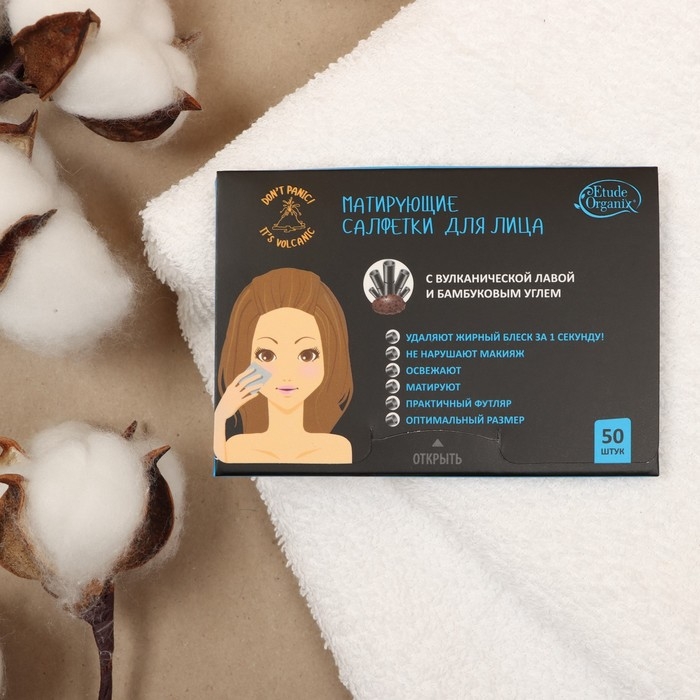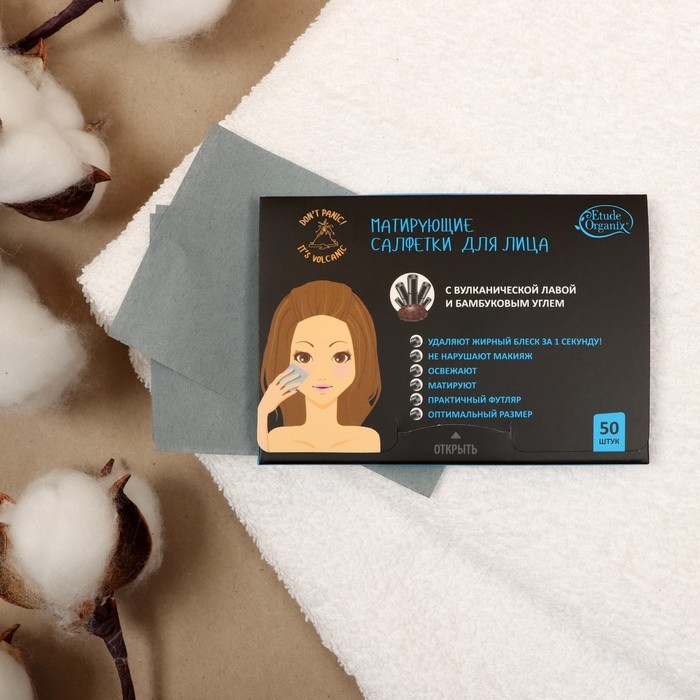 Матирующие салфетки Etude Organix Volcanic, для лица с бамбуковым углем, 12 г, 50 шт.