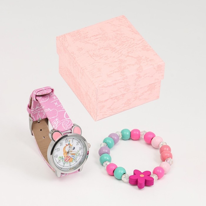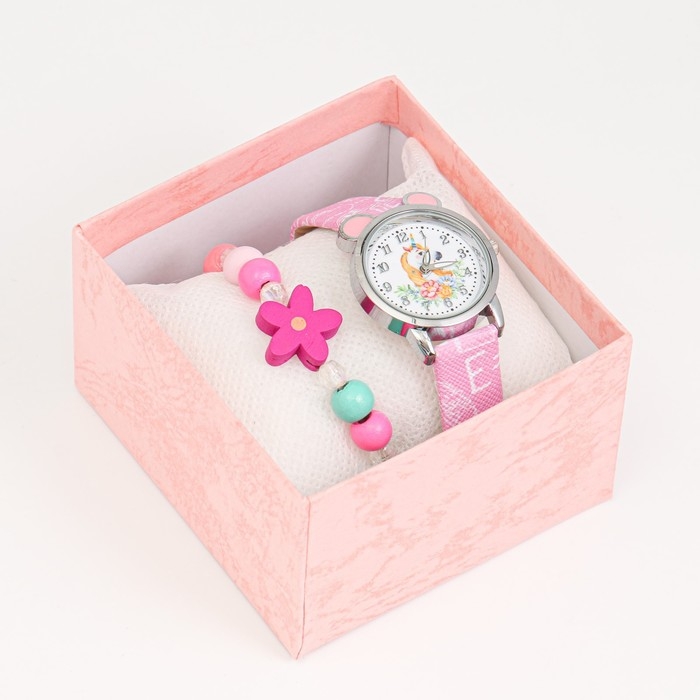 Детский подарочный набор для девочек "Единорожка" 2 в 1: наручные часы, браслет, d-2.5 см