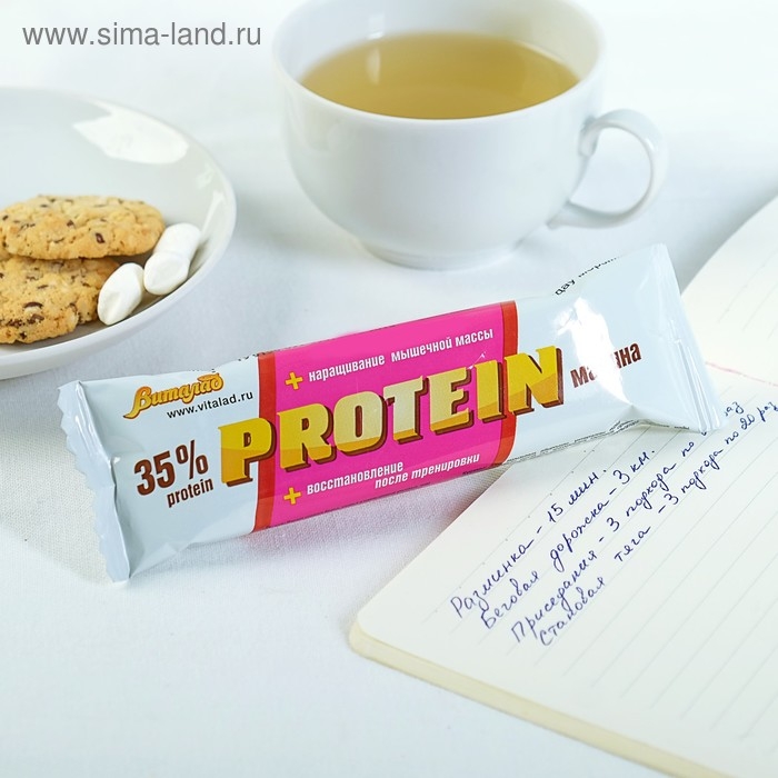 Сытный батончик «Протеиновый с малиной» создан на основе измельченных овсяных хлопьев. Низкая калорийность сочетается с высоким содержанием белковых веществ, которые отвечают за наращивание мышечной массы. Благодаря какао-маслу и карамельной патоке десерт отличается приятной сладостью. Начинка из малины дарит продукту яркий летний аромат. Шоколадно-ванильная глазурь окутывает корпус батончика тонким хрупким слоем.