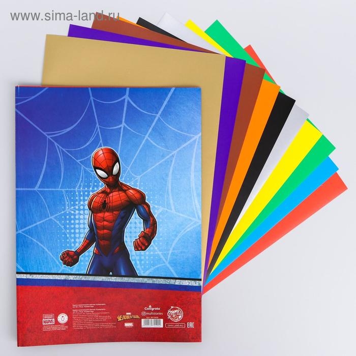 Бумага цветная самоклеящаяся, А4, 10 листов, 10 цветов, мелованная, односторонняя, в папке, 80 г/м², Человек-паук