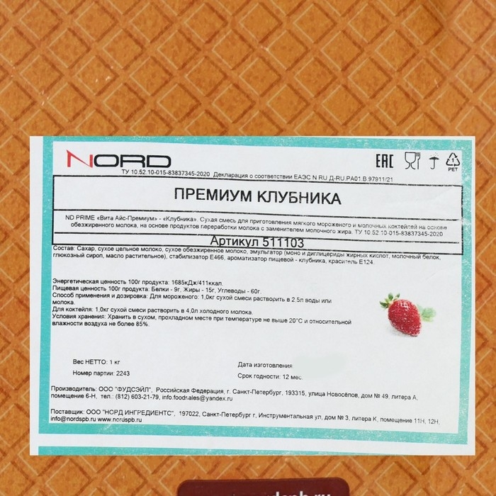 Состав: сахар, сухое цельное молоко, сухое обезжиренное молоко, эмульгатор (моно и диглицериды жирных кислот, молочный белок, глюкозный сироп, масло растительное), стабилизатор Е466, ароматизатор пищевой – клубника, краситель Е124.