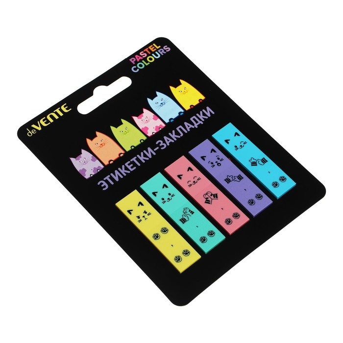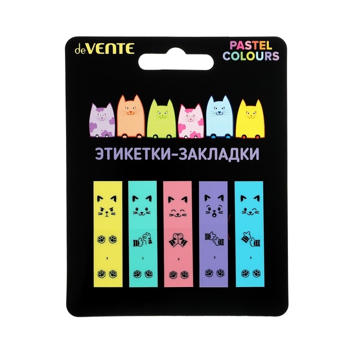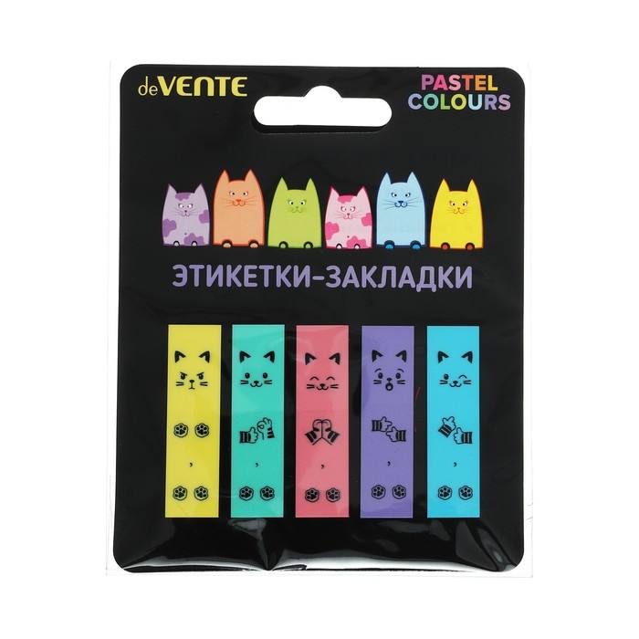 Набор самоклеящихся этикеток-закладок deVENTE. Cats пластиковые с дизайном, 45 x 12 мм, 5 x 20 листов, 5 дизайнов, в картонном блистере и пластиковом пакете с европодвесом.