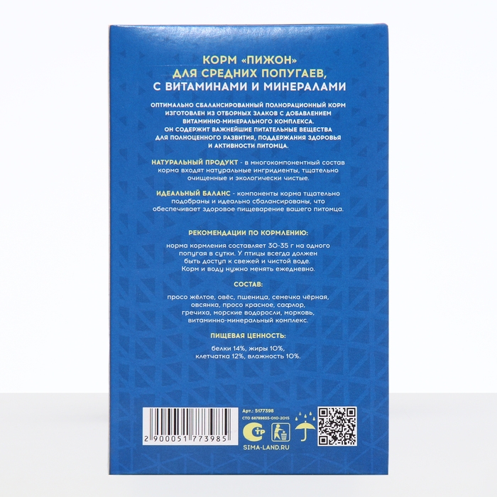 Состав: просо желтое, овёс, пшеница, семечка чёрная, овсянка, просо красное, сафлор, гречиха, морские водоросли, морковь, витаминно-минеральный комплекс.