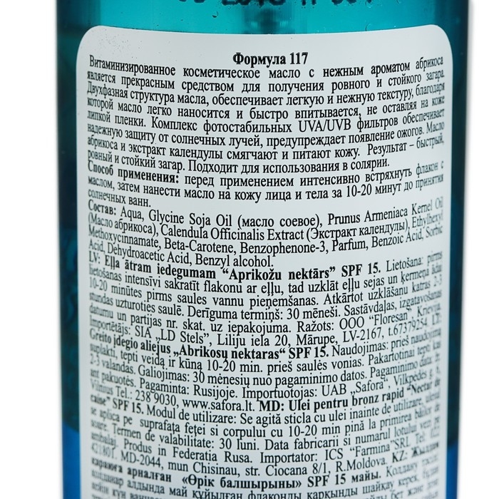 Витаминизированное косметическое масло с нежным ароматом абрикоса является прекрасным средством для быстрого получения и усиления загара. Двухфазная структура масла, обеспечивает легкую и нежную текстуру, благодаря которой масло легко наносится и распределяется на коже, быстро впитывается и оставляет на коже комфортную защитную пленку. и биоактивные компоненты соевого масла препятствуют вредному действию жестких УФ – лучей, предотвращают появление ожогов, предупреждают световое старение кожи, питают и смягчают ее. Комплекс природных увлажнителей нормализует уровень влаги в клетках кожи, исключая появление сухости и шелушения на коже. Рекомендуется использовать в комплексе с «Крем – гелем для сохранения загара» (формула 109) для укрепления и продления загара. Подходит для использования в солярии. Способ применения: перед применением интенсивно встряхнуть флакон с маслом, затем нанести масло на кожу лица